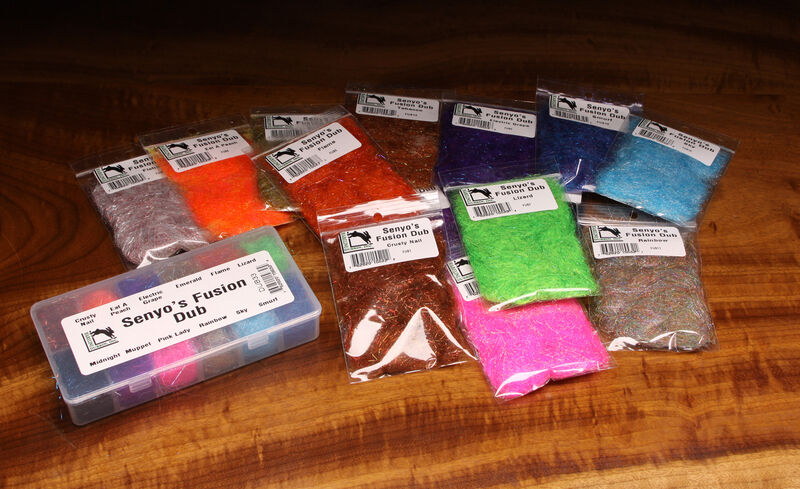 Hareline Senyo's Fusion Dub Dispenser contains the 12 most popular colors of this synthetic dubbing mix with added flashabou. Featuring the best named dubbing colors ever like Crusty Nail, Eat A peach, and Smurf plus a relatively long fiber length.