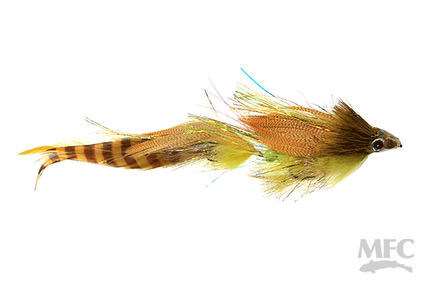 Tommy Lynch’s Drunk and Disorderly Deceiver has made a big splash in the streamer world over the last several years, and has accounted for some seriously large fish for us since we started stocking them in the shop. The Triple D is a large articulated streamer with tons of flash and a deer hair head cut at an angle to give the fly a diving or fluttering motion in the water. This pattern is able to achieve an erratic action similar to that of the swimmi. jimmy because the head is treated with a UV resin– Creating a hydrophobic wedge that forces water over the body at different angles each time it is retrieved.